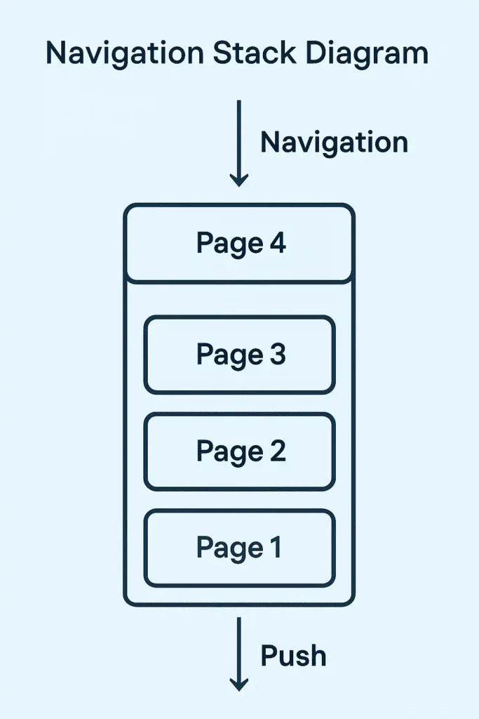 Flutter uses a stack-based navigation model. The current screen sits on top of the stack, and when a new screen is pushed, it sits above the previous one. When popped, the screen is removed from the stack.